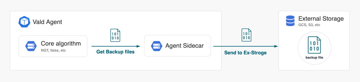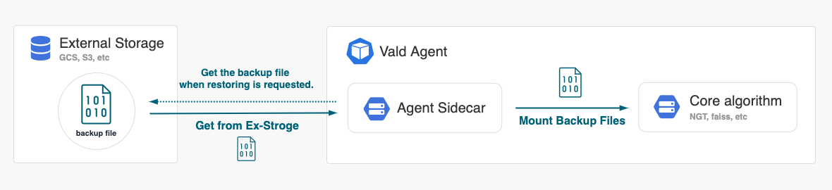 - When the Vald Agent Pod restarts, the index structure is restored from the external backup files.